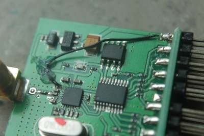 Auf der Rückseite muss von dem Pegelwandler IC das Signal an den zweiten Pin der Buchsenleiste gelegt werden. Dazu nimmt man einen dünnen Kupferlackdraht und lötet ihn vorsichtig an das dritte Beinchen von oben (siehe Bild) und auf der anderen Seite an den zweiten Pin der Buchsenleiste (an dem, wo in der Funke der Widerstand hägt; Die Anleitungen im Netz unterscheiden sich hier Teilweise!).