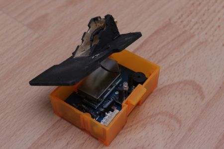In dem original Plastikdeckel waren auf der Innenseite zwei Abstandshalter, damit die Platine nicht herausgedrückt wird. Ein kleines eingeklemmtes Stück Holz in der unteren rechten Ecke wird aber wohl auch reichen.
