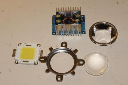 Hier zu sehen, LED, Reflektor, Linse mit Halterung und ein Stepup Converter mit Strombegrenzung. Den hier abgebildeten konnte ich später aber nicht verwenden.
