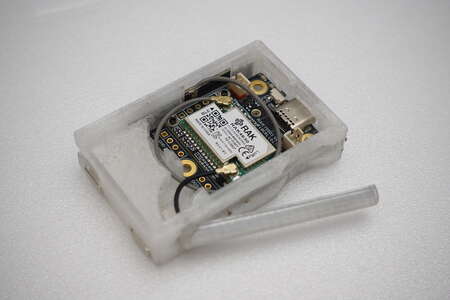 Erst die Platine rein schieben. Danach die Bluetooth Antenne an ihren Ort befördern. Jetzt kann der u.fl Stecker der LoRa Antenne auf das RAK Modul gesteckt werden. Dadrauf als Barriere zwischen scharfen Kanten der Antennenstecker und dem empfindlichen LiPo ein Stück Tape. Der Ein/Aus Schalter wird direkt auf dem USB-C Anschluss angebracht und durch ein Loch im Deckel gehalten. Damit schließt er bündig ab und kann nicht versehentlich eingedrückt werden.
