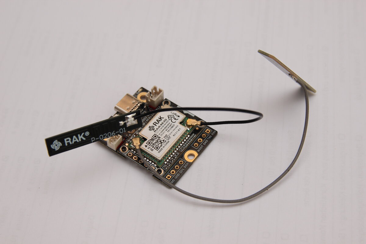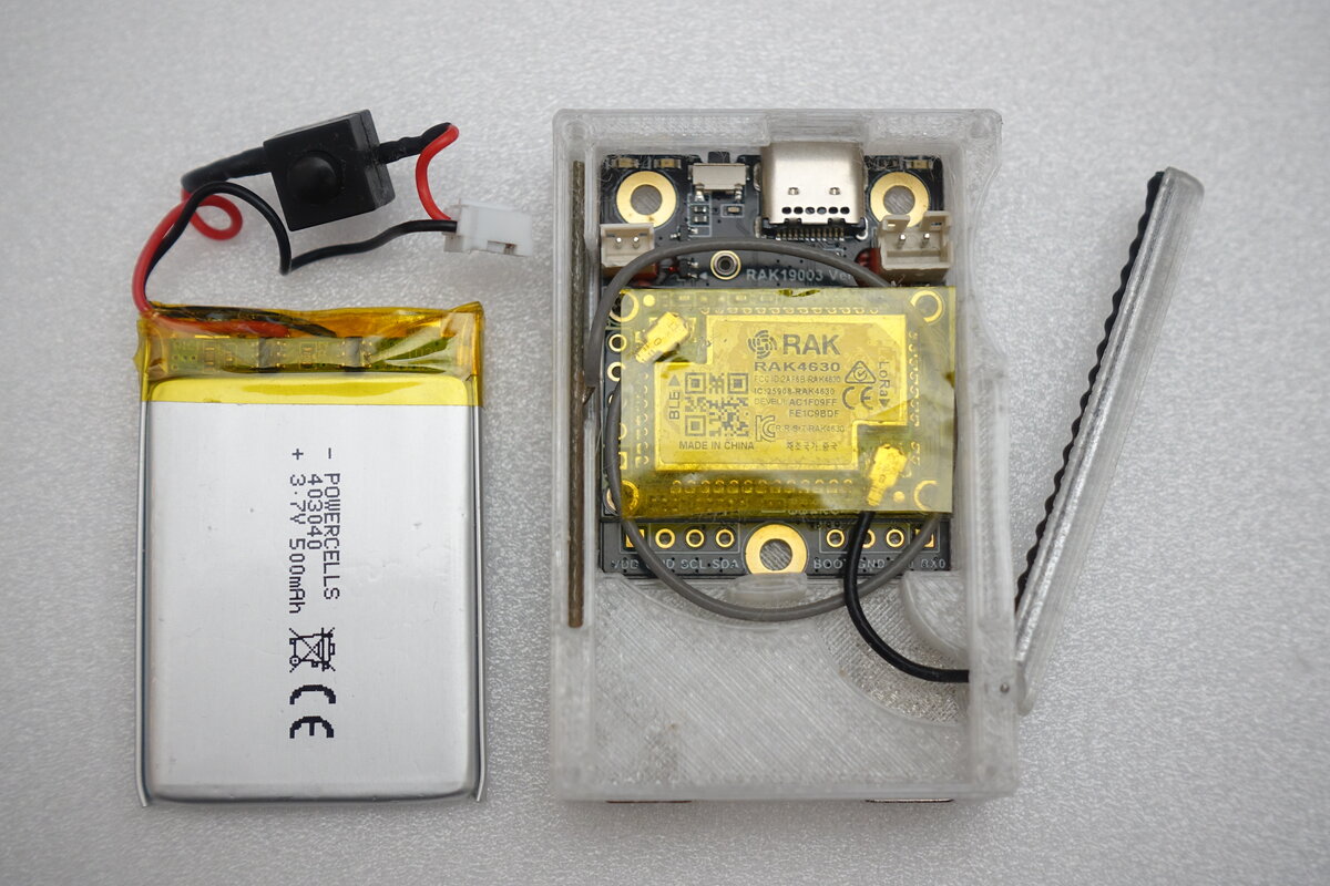 kaufte ich mir ein RAK19003 WisBlock Mini Base Board mit einem RAK4631 WisBlock LoRaWAN Module. Der Akku sollte nicht viel größer als das Base Board sein. Eine 500mAh LiPo Zelle (41 x 30 x 4mm) hatte die gleiche Breite und sollte mit der Kapazität länger als 2 Tage halten. Wichtig ist hierbei auf das Vorhandensein einer Schutzschaltung zu achten, da das Base Board zwar einen Laderegler hat, sich jedoch sonst nicht um die Gesundheit des Akkus kümmert. Da zur Bedienung ein Smartphone mit der Meshtastic App benötigt wird braucht es z.B. beim Camping eh nach zwei Tagen eine Powerbank.