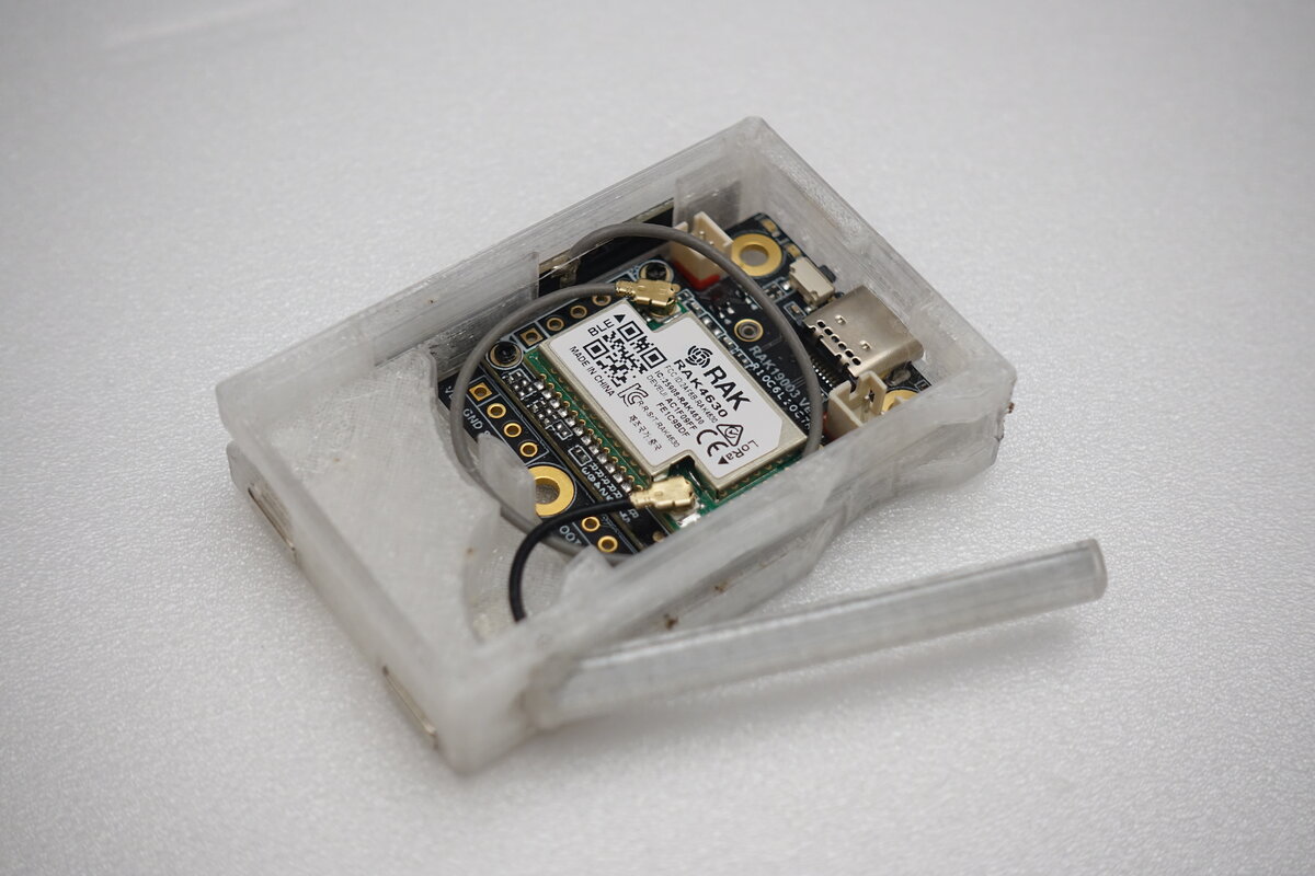 Erst die Platine rein schieben. Danach die Bluetooth Antenne an ihren Ort befördern. Jetzt kann der u.fl Stecker der LoRa Antenne auf das RAK Modul gesteckt werden. Dadrauf als Barriere zwischen scharfen Kanten der Antennenstecker und dem empfindlichen LiPo ein Stück Tape. Der Ein/Aus Schalter wird direkt auf dem USB-C Anschluss angebracht und durch ein Loch im Deckel gehalten. Damit schließt er bündig ab und kann nicht versehentlich eingedrückt werden.