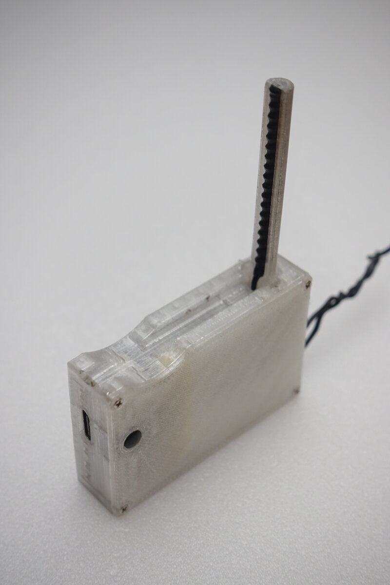 Nach mehreren Iterationen entstand das folgende Gehäuse für die genannten Komponenten. Die Platine wird nur hereingelegt und durch Akku und Deckel in Position gehalten. Vorne ist ein Loch für den USB-C Anschluss, sowie kleinere Löcher für LEDs und User Button. Dieser Button ist mit einem kleinen Stück Draht erreichbar, allerdings habe ich ihn bisher noch nie benötigt. Links von der Platine ist ein Schlitz, in dem die Bluetooth Antenne eingesteckt wird. Hier war mir die Reichweite nicht so wichtig, trotzdem bin ich in der gesamten Wohnung immer mit der Node verbunden. Bei der Antenne war ich mir unsicher, wie sehr die Nähe zur Platine Einfluss auf die Reichweite hat. Daher wurde sie ausklappbar gemacht. Weitere Features sind eine Lasche für ein Tragebändchen oder Kabelbinder. Ein Kabelbinder hat sich als durchaus Nützlich erwiesen, um den Kasten an höheren Orten, dem Fahrrad oder Jacke temporär anzubringen. Zwei Schlitze am Boden ermöglichen es Magnete einzusetzen. Somit lässt sich die Node beispielsweise an Geländern anbringen.