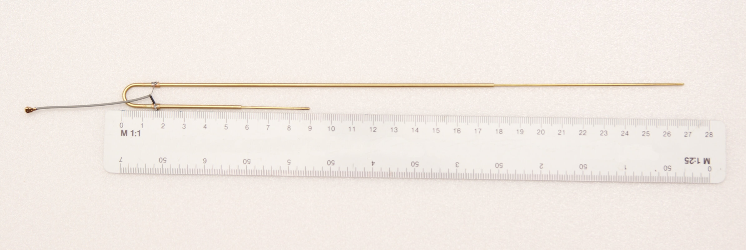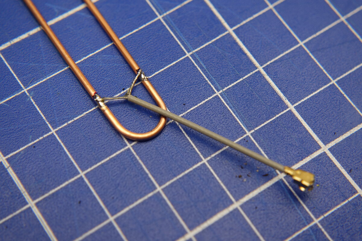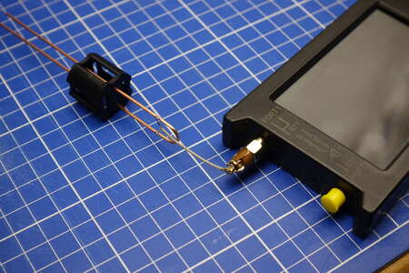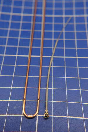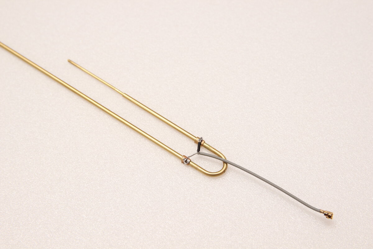 Zeitgleich testete ich mit einem VNA verschiedene Antennen aus, die ich für Meshtastic angeschafft hatte. 90% davon waren nicht annähernd auf 868 MHz abgestimmt. Auf der Suche nach interessanten Bauformen stieß ich auf die J-Pole Antenne. Die Angaben aus dem Slim Jim and J-Pole Calculator für eine Frequenz von 869,525 MHz (Slot 1 auf EU_868) sahen schlüssig aus und die Bauform erlaubt es nachträglich die Längen anzupassen. Der Biegeradius ist angeblich nicht kritisch, damit bleibt die Länge des langen Drahtstücks, des Kurzen und die Höhe des Feedpoint. Aus den Berechneten Werten entnehme ich, dass die lange Seite “A” dreimal so lang ist wie die kurze “C”. Den Radius erreiche ich mit einem 8mm Bohrer als Biegehilfe. Bleiben noch als Variablen der Anschlusspunkt des Koaxialkabels und die Antennenlänge. Durch einen quick and dirty Test erkannte ich, dass selbst wenn Maße aus dem Rechner bestmöglich eingehalten werden die Resonanzfrequenz der Antenne einige dutzend MHz daneben liegen kann. Um zunächst ein Gefühl für die Auswirkung der verschiedenen Parameter zu bekommen entschied ich mich einfach eine Variable J-Pole Antenne zu bauen. Dazu besteht der Großteil der Antenne aus einem 2mm (OD) Messingrohr, in das ein Messingdraht gesteckt werden kann. Biegen lässt sich das Rohr besser, wenn der Biegepunkt nicht Hohl ist sondern mit einem kurzen Stück draht gefüllt wird. Um auf die berechnete Länge zu kommen klemmen an beiden Enden Drähte in dem Rohr, die sich mit einer Zange vor und zurück schieben lassen. Als Anschluss diente eine WiFi Antenne mit U.FL Kabelbuchse. Schirm und Leiter sind auf ein kleines Stück aufgebogenes Messingrohr gelötet, was auf der Antenne sitzt und sich ebenfalls mit etwas Kraft verschieben lässt. Mit dem gewonnenen Wissen werde ich zukünftig J-Pole Antennen weniger kompliziert aus 1,5 mm2 Kupferdraht herstellen und die Feinabstimmung nur durch Schrittweises Kürzen durchführen.