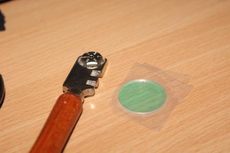 Mit einem Glasschneider lässt sich die kleine Glasscheibe in kleine auf den hinteren Teil einer Linse passende Quadrate zerkleinern. Da der Filter so klein ist war es nicht einfach, das Glas sauber zu schneiden. Solange das Glasstück aber die hintere Linse komplett abdeckt und sich dort keine Kratzer befinden ist das aber eigendlich kein Problem.