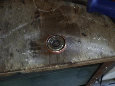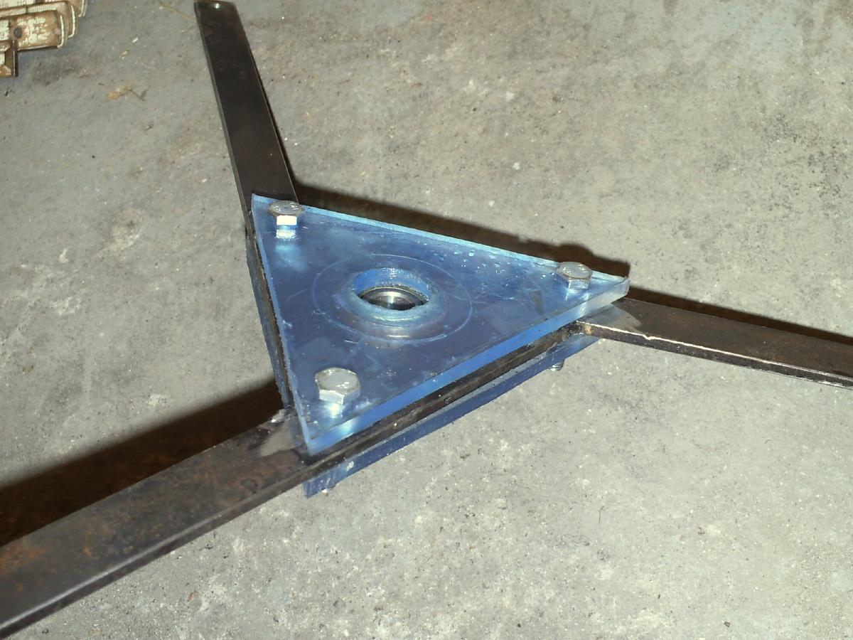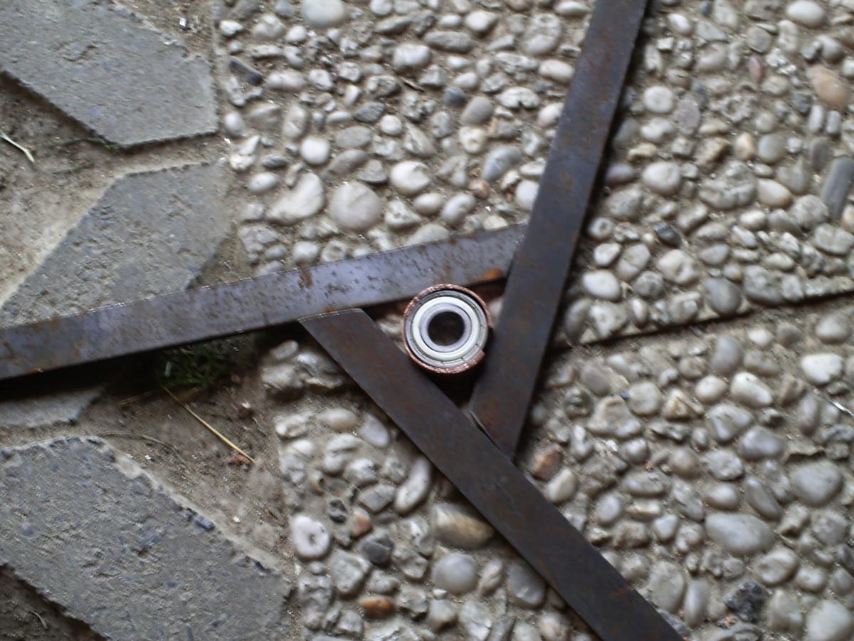 Das Kugellager (2,8cm Aussendurchmesser) wird mit einem kleinen Ring aus Kupferrohr als Abstand in das Dreieck geklemmt