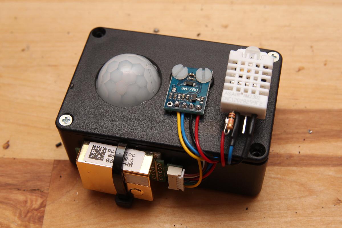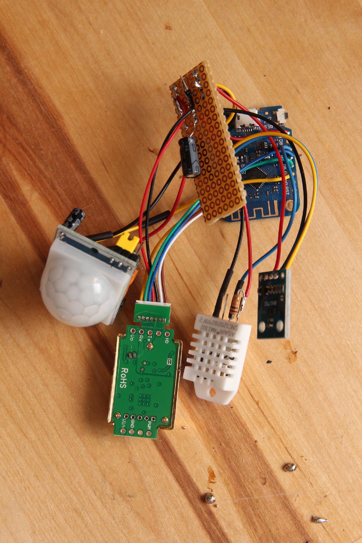 Bei dieser Messstation ist beispielsweise ein HC501-SR PIR Bewegungssensor, ein MH19-B CO2 Sensor, ein AM2302/DHT11 Luftfeuchtigkeit und Temperatursensor sowei ein BH1750 Helligkeitssensor angeschlossen.