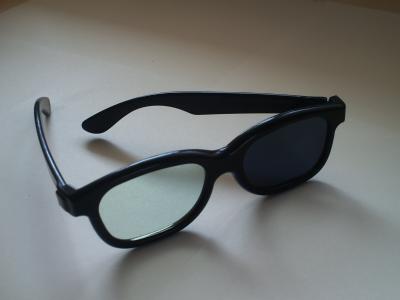 Hier die RealD Brille. (Bei diesem Foto befindet sich ein weiterer Polfilter vor der Kameralinse, wodurch ein Brillenglas verdunkelt erscheint)