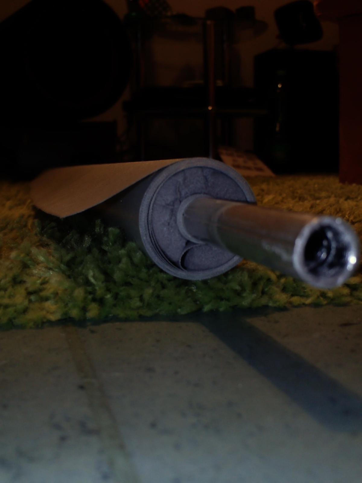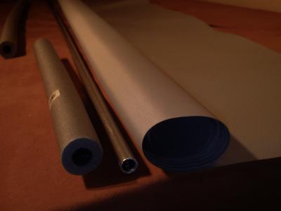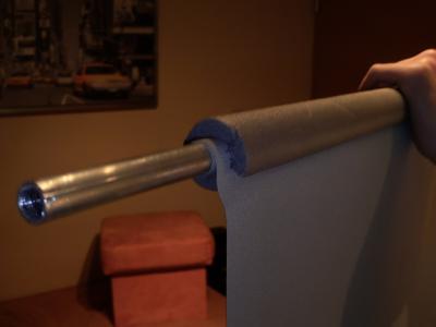 Damit die Leinwand auch an dem Rohr hält, hab ich sie ein paar mal um das Alurohr (mit einem Durchmesser von 15mm) gewickelt. Darüber dann die Rohrisolierung, damit der Stoff nicht zu eng aufgeollt wird.