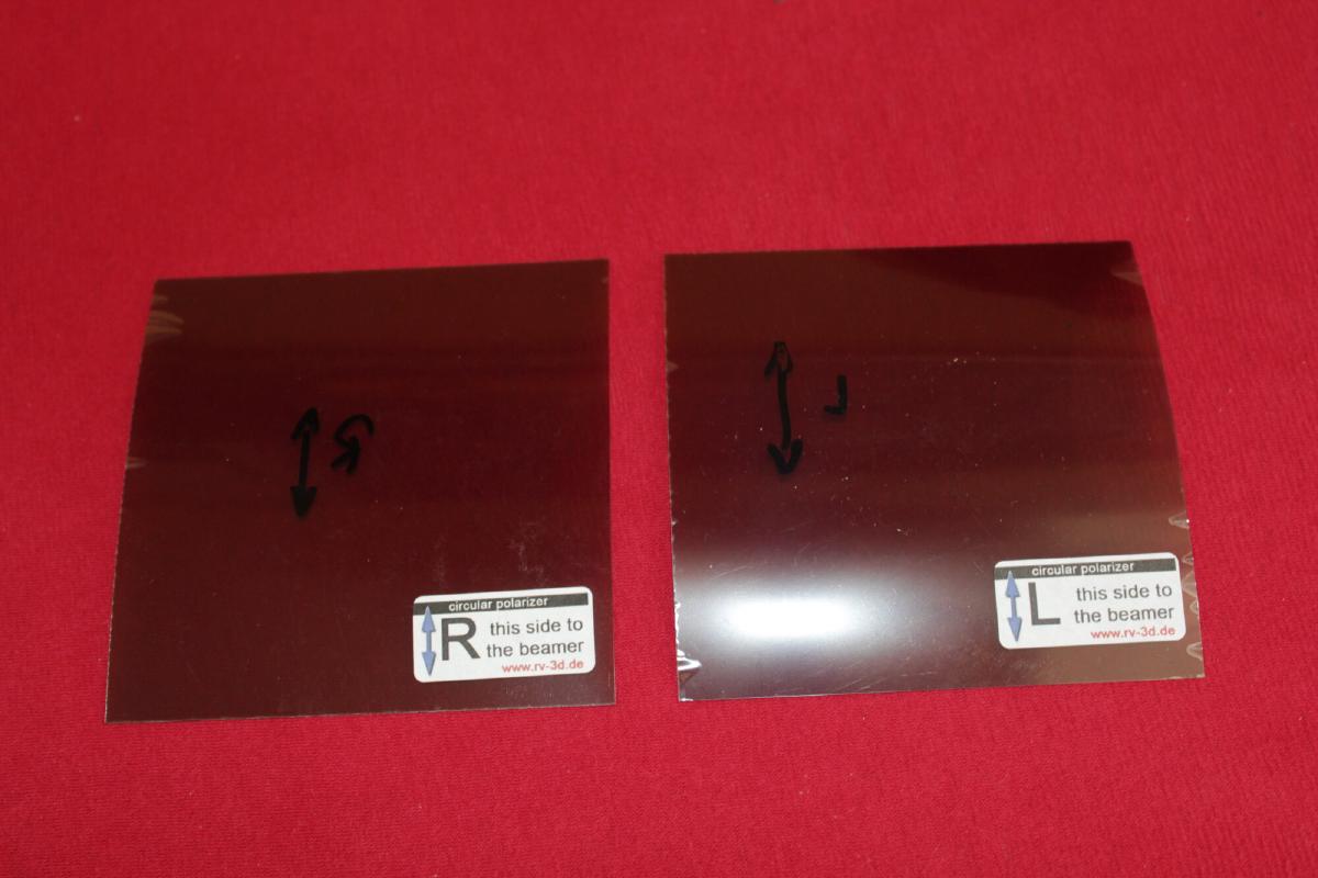 Die zwei 10cm x 10 cm zirkularen Polfilter hab ich bei realvision-3d für 30€ gekauft. Die zwei neuen RealD Brillen hab ich für je 1,19 gleich mitbestellt.
