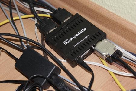 Um mehrere Monitore an einen Ausgang anzuschließ gibt es die Matrox DualHead2Go und TripleHead2Go Boxen. Dabei kostet die DualHead2Go (analog) neu ca. 150€. Ich hatte das Glück eine bei Ebay für 30€ zu bekommen.