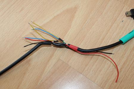 Dort mussten beide Kabel abgeschnitten werden um die für die Spannungsversorgung vorgesehenden Adern zu verbinden (hier Rot (+5V) und Schwarz (GND) ).