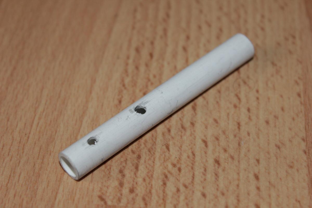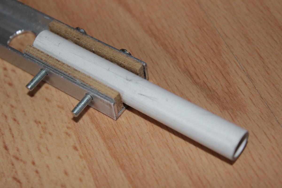 Das 10mm PVC Rohr wird durch zwei M3 Gewindeschrauben und zwischen zwei kleinen Holzstreifen am Ende des kürzeren Arms angeschraubt. Auf dem überstehenden Ende soll sich ein Holzklotz als Motorhalter frei drehen können