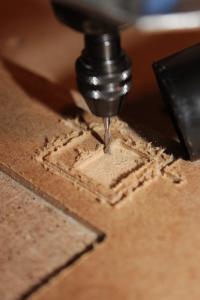 Nebenbei musste noch der drehbare Holzklotz hergestellt werden. Wieder einmal half mir die CNC mit der ich den Klotz, bestehend aus drei Teilen, aus zwei mal 10mm dickem Holz und einer 5mm dicken MDF Platte gefräst hab.