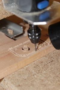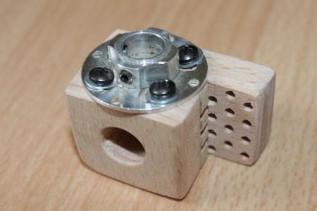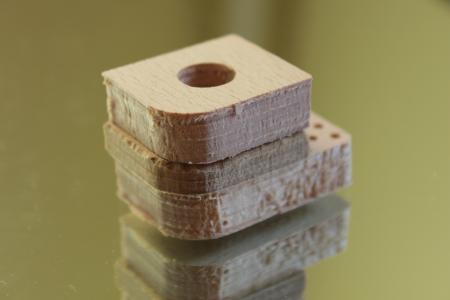 Diese hab ich dann zusammengeleimt. Durch die zwei kleinen Löcher neben dem großen Loch hab ich einen kleinen Holzstift gesteckt, welcher den Klotz zusätzlich gegen verdrehen schützen soll