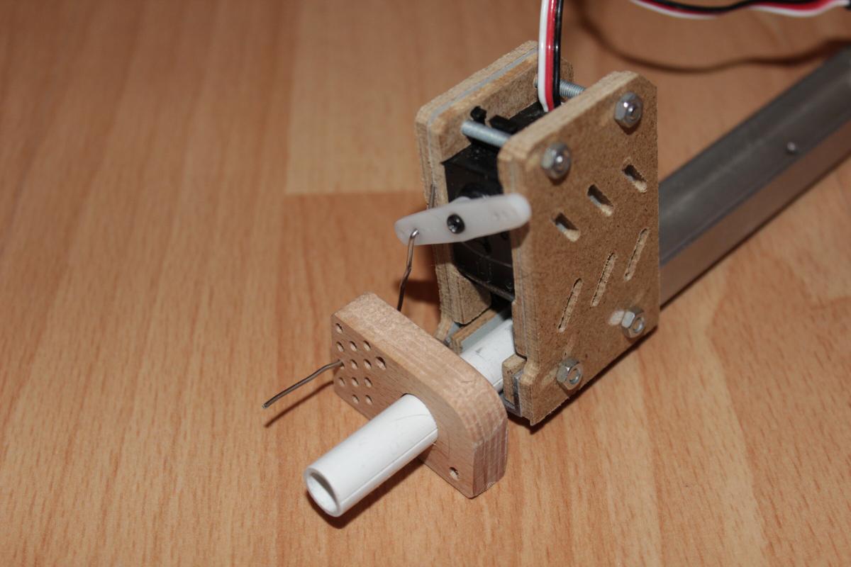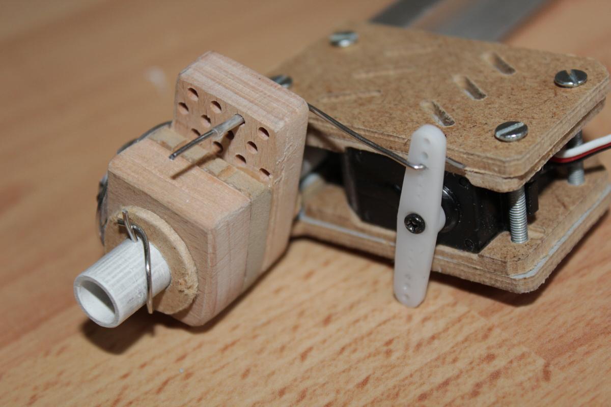 Hier sieht man auch nun, wie der Servo zwischen den zwei Platten (s.o.) durch zwei größere Hartfaserplatten (die mit dem Pfeilmuster), welche an dem Aluprofil angeschraubt sind, eingeklemmt wird.