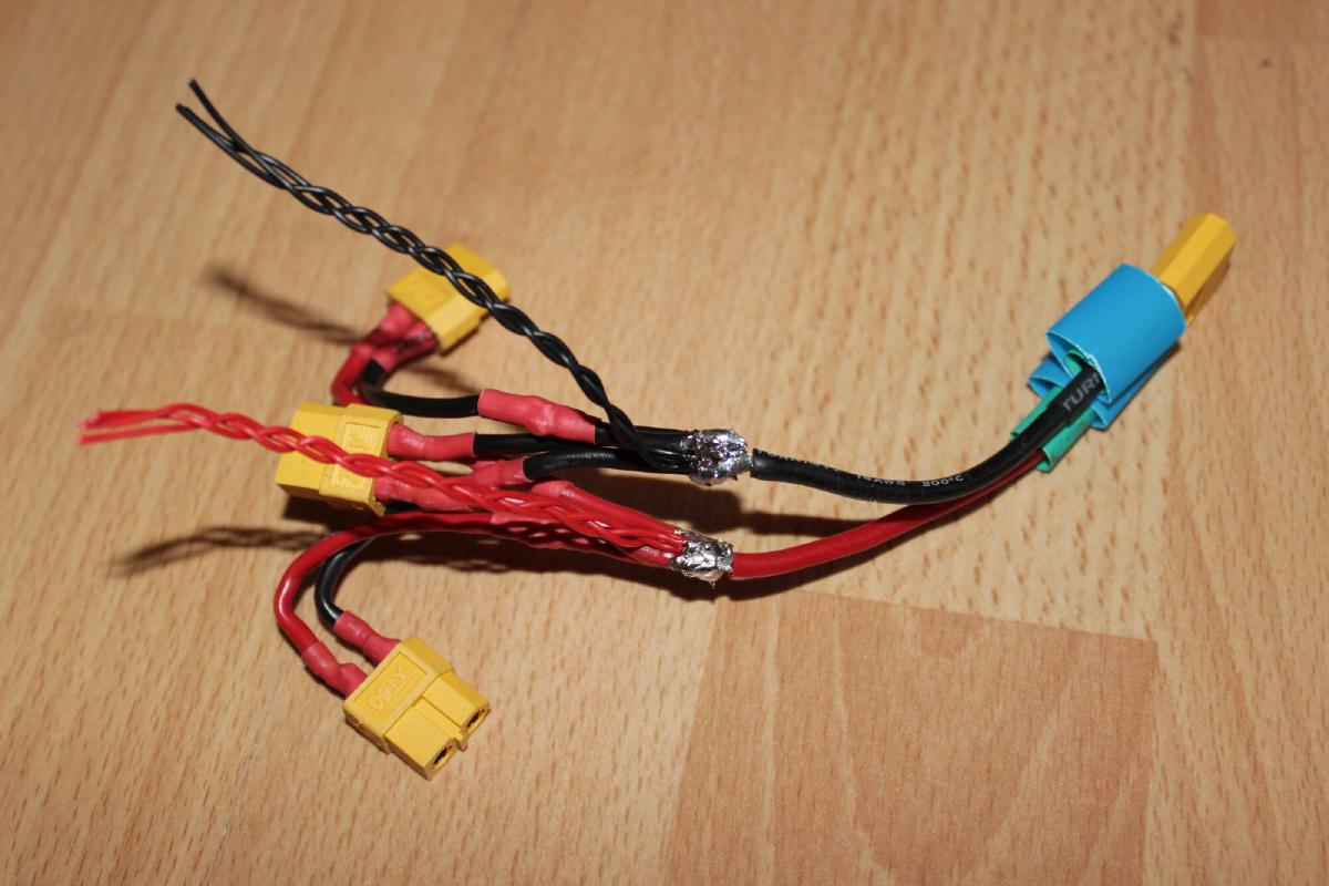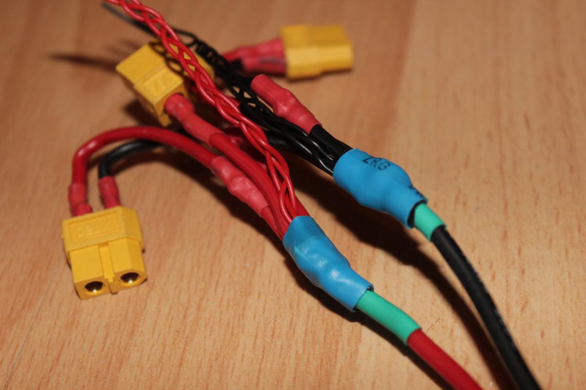 Um die drei ESC’s mit dem Akku zu verbinden musste eine Stromverteilung gelötet werden. Da der Platz für eine Stromverteilungsplatine mir zu klein war, hab ich wiedereinmal alle Kabel in einem Haufen zusammengelötet. Die zwei geflochtenen dünnen Kabel sollen später die LED-Beleuchtung versorgen.