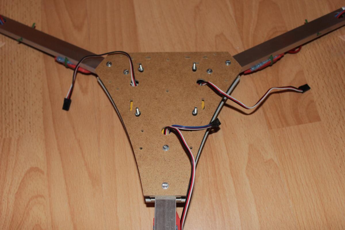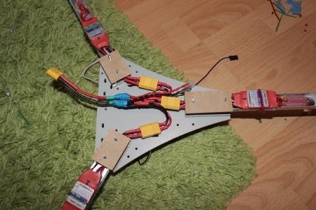 Bei den Armen hat sich zu vorher eigendlich nicht viel getan. Der Abstand Mittelpunk - Motor ist auf 30cm geschrumpft und die ESC’s werden unterhalb der Arme befestigt.