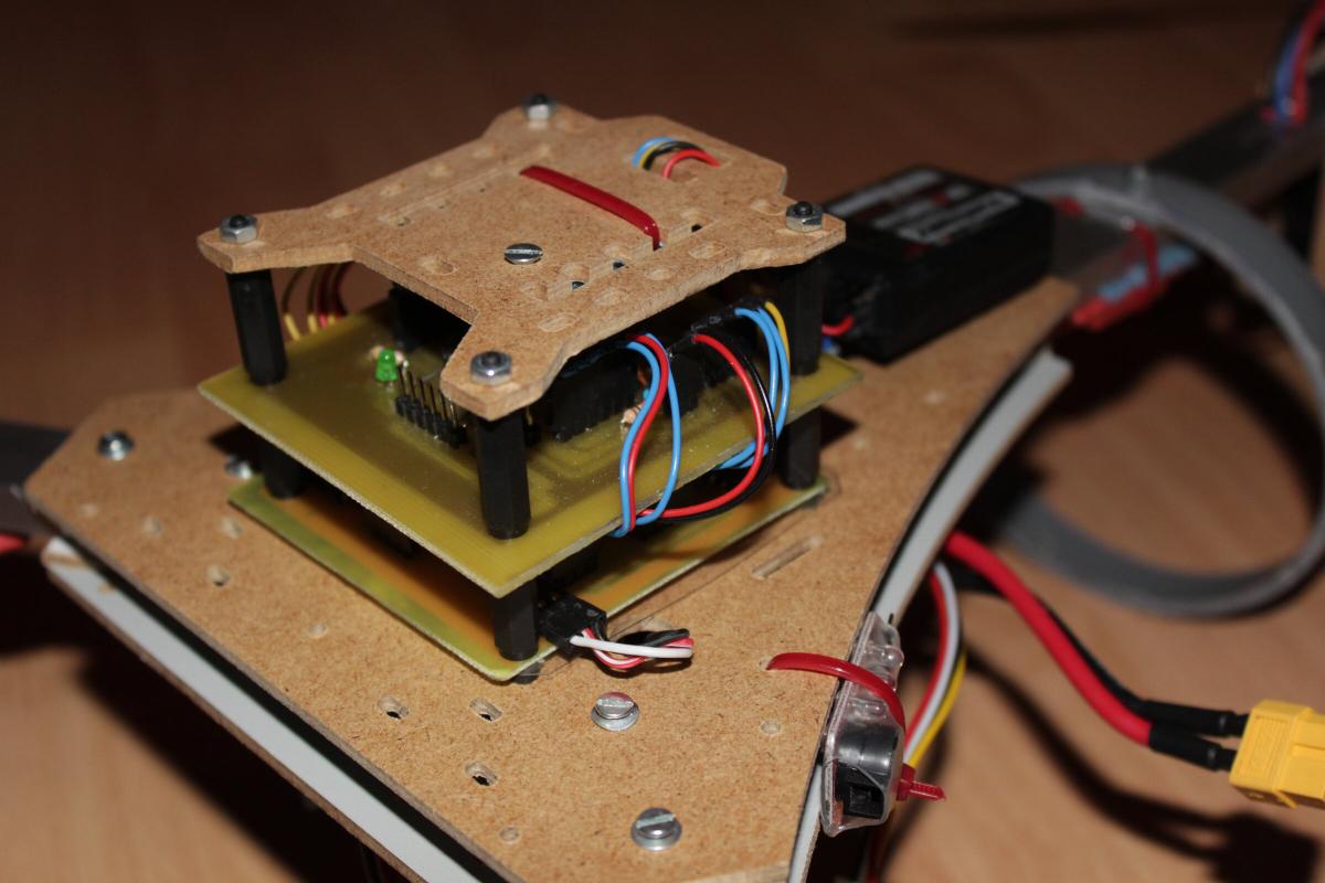 Dann noch ein Closeup der Flightcontrol. Die Kabel von den ESC’s/des Servos kommen, wie als währ es so geplant, passend durch die Centerplate nach oben und werden an die Verteilerplatine gesteckt (Versteckte Ironie, es war so geplant).