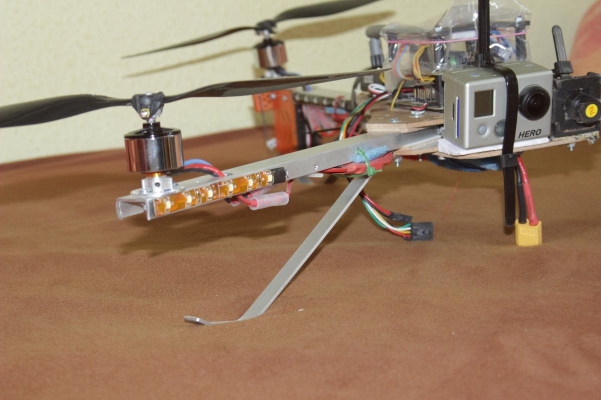 - Änderung: Anstelle der Landeringe befinden sich nun Landebeine aus Alu unter jedem Arm. Sie sind etwas leichter als die Ringe (ein Ring ca. 17 Gramm, eine 25cm Alustange etwa 12 Gramm). Viel wichtiger aber: Sie lassen den Copter bei härteren Landungen nicht so sehr hüpfen.