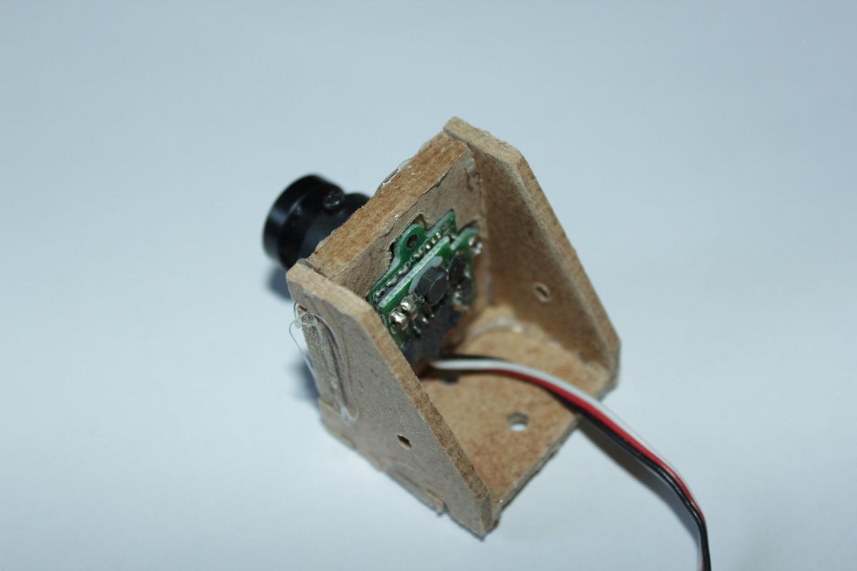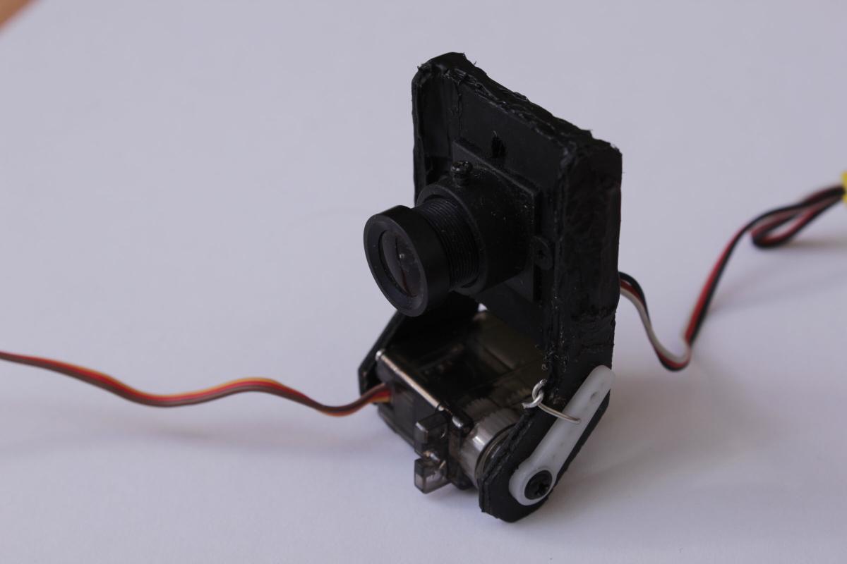 Der Servo ist mit Kabelbinder auf einer kleinen Holzplatte befestigt. Die verwendete Kamera ist eine FH18C von Foxtech.