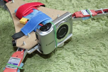 Meine ersten Videoflüge fanden mit einer Mini Kamera von Pollin für 15€ statt. Diese hatte ich mit Kabelbinder an ein Stück Aluminiumstange gebunden und auf einem der Arme befestigt. Da diese Minikamera neben einer niedrigen Auflösung (640x480) auch noch einen unglaublich stark eingeschränkten Blickwinkel hat wollte ich auf eine “normale” Digitalkamera umsteigen.