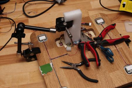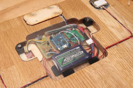 Zuletzt müssen die Komponenten noch verstaut werden. Mit einem Proxxon Multifunktionswerkzeug und einem kleinen Fräser liessen sich Rillen für die Kabel fräsen. Etwas Heißkleber hilft dabei, sie dort zu fixieren.