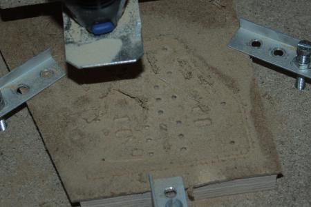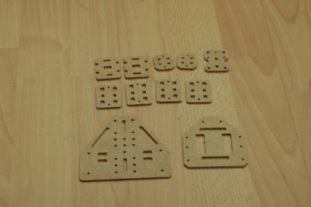 Der Motor wird an einem Aluwinkel angeschraubt, der wiederum von unten an einer 2.5mm MDF Platte angeschraubt ist. (DXF Files der CNC-Fräsungen siehe unten)