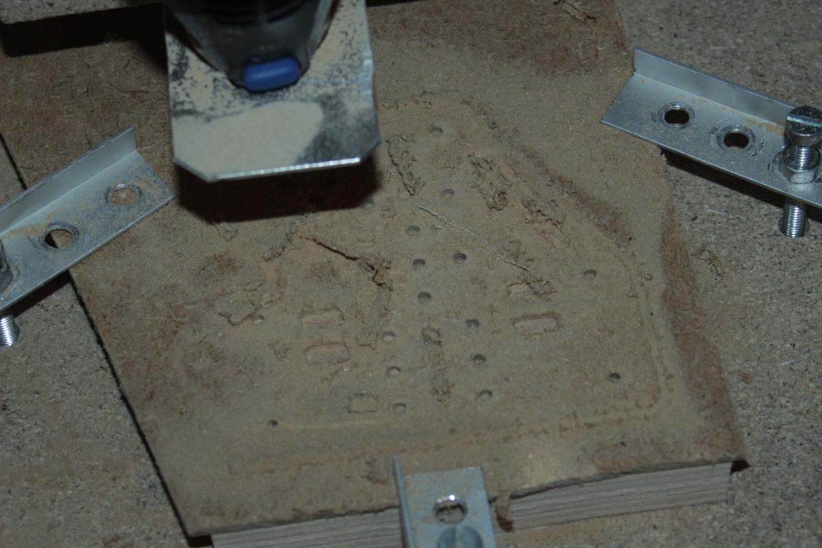 Daher wird er in das Domodur eingelassen und ragt nurnoch ein paar mm oben raus. Um die Kabel zum ESC zu führen musste ich einen kleinen Kanal einfräsen. Dazu einen alten abgebrochenen 3er Bohrer in den Dremel der CNC gespannt. Das Domodur konnte ich dann per Hand parallel zum Fräser bewegen und so etwa 1cm wegfräsen.