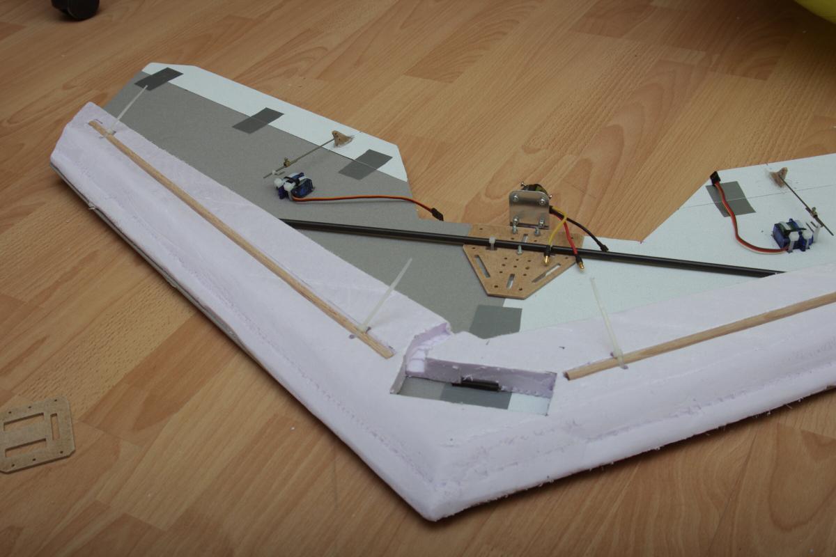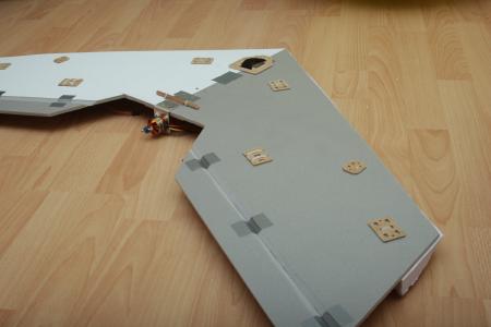 Die Elevons halten mit ein wenig Panzertape wunderbar. Zudem wird der ganze Flieger nachher eh komplett “eingepackt”.