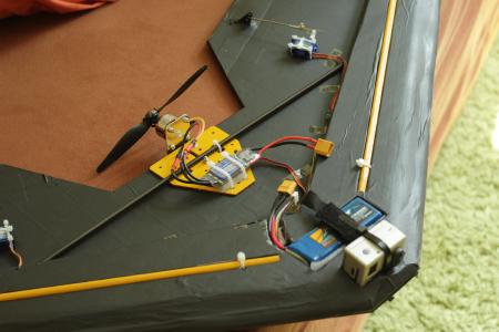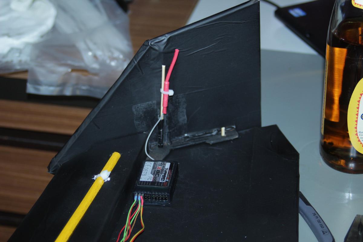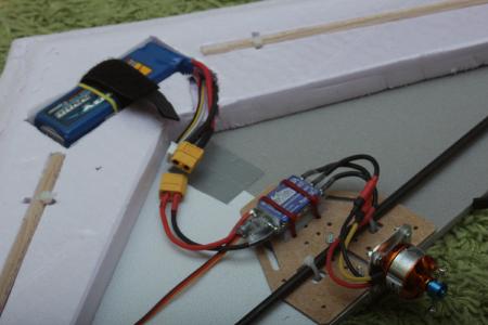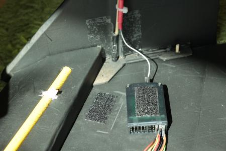 Der Lipo (aktuell ein 3S 2200 mAh) muss relativ weit nach vorne um den Schwerpunkt bei etwa 22cm (von der Spitze aus gemessen) zu halten.