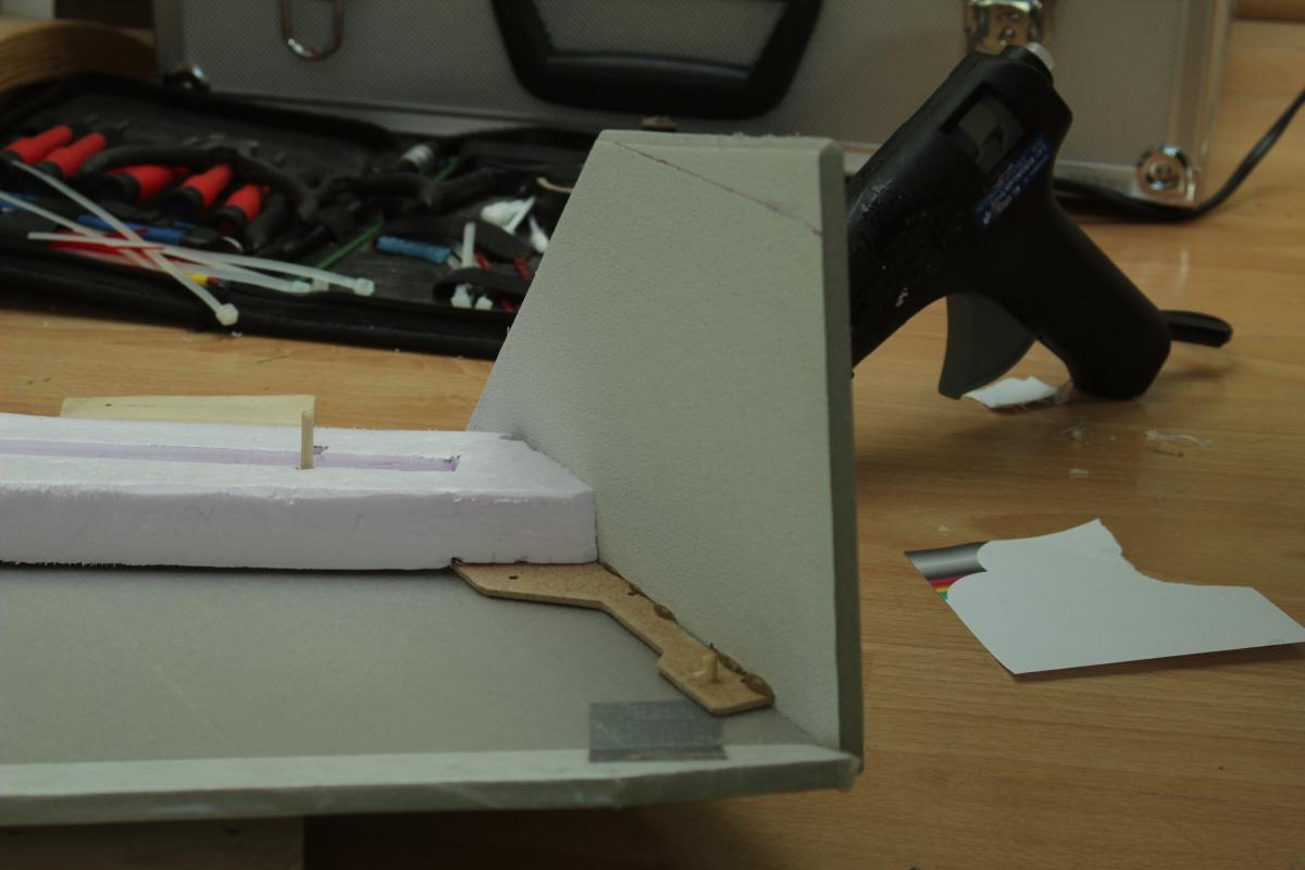 Um dem Ganzen noch etwas mehr Steifigkeit zu verleihen hab ich zwei Holzstäbe in das Domodur eingelassen. Die Kabelbinder drücken die Holzstäbe und die 4 kleinen Holzplatten auf der Unterseite zusammen und halten somit das Domodur und den Rest des Wings zusammen.