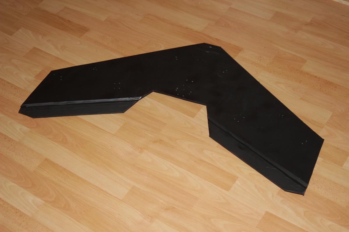 Daher wiedereinmal aus MDF ein Teil gefräst um die Winglets seitlich in den Wing zu stecken. Mit von oben durchgesteckten Schaschlickspießen fallen die dann auch nicht im Flug ab (glaube ich).