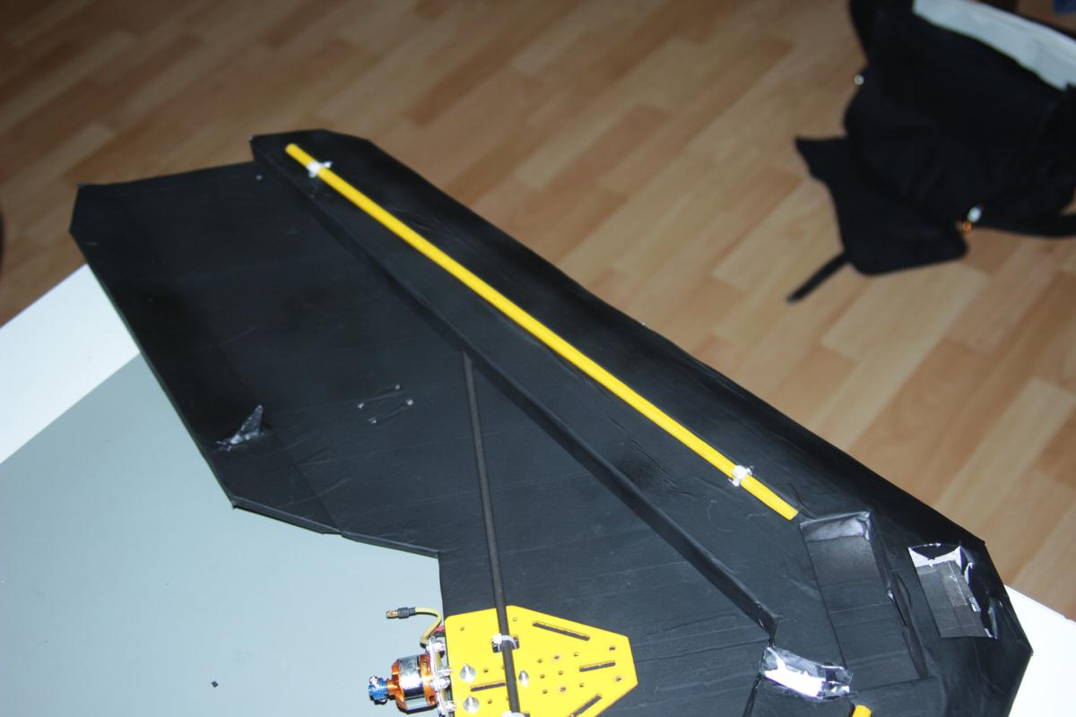 Um den Wing in der Breite Stabilität zu geben hab ich ein 6mm GFK Rohr auf der Oberseite angebracht. Selbstverständlich mit Kabelbindern und kleinen Holzplatten auf der anderen Seite.