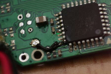 Zum Glück liegen die 3.3-4.2V des Lipo und der Pin am Atmega sehr dich beieinander. Eine kurze Brücke über die große Massefläche direkt an Pin 24 und das wars auch schon fast.