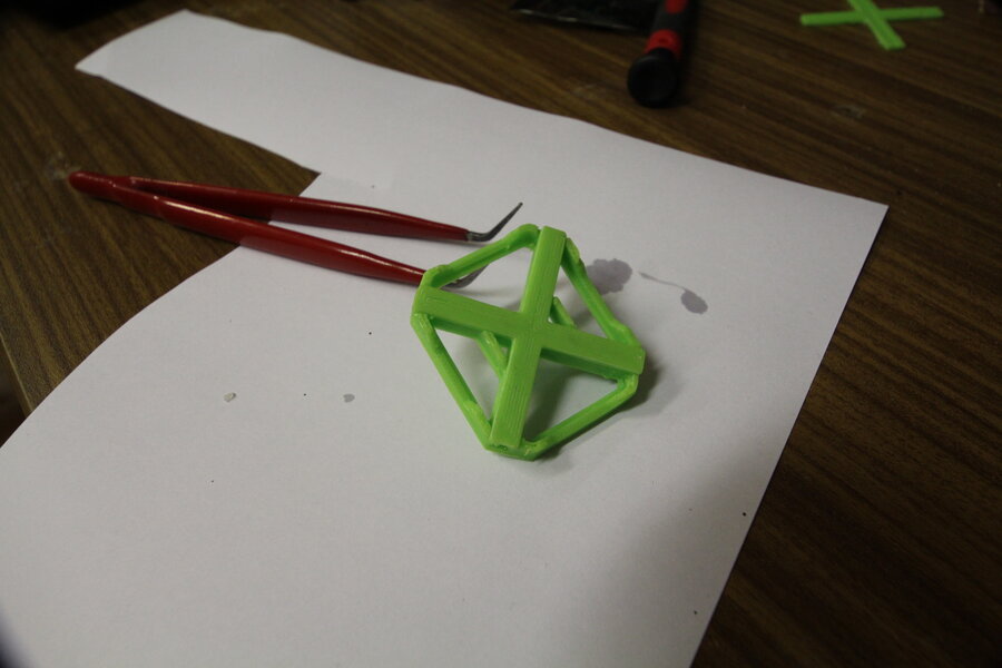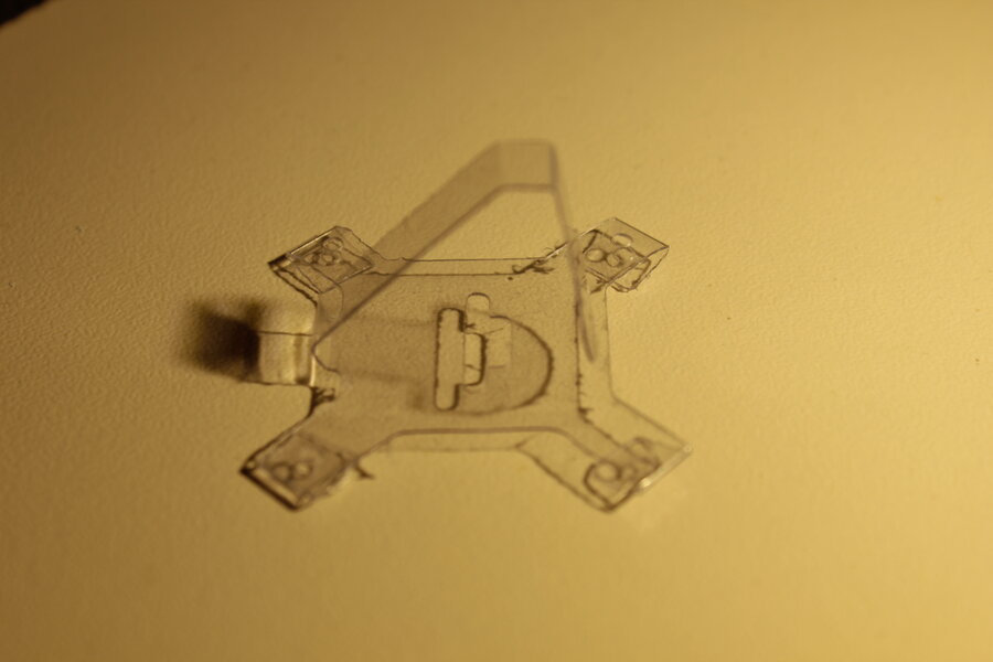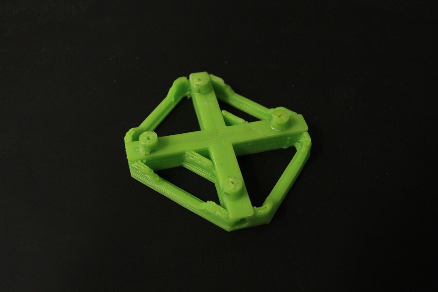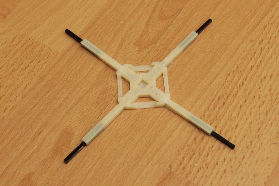 Heraus kam ein größtenteils 3D gedrucktes Frame. Um die Motorhalter aufzustecken sind an den Enden der Arme jeweils 3mm x 3mm gefräste GFK Stäbchen.