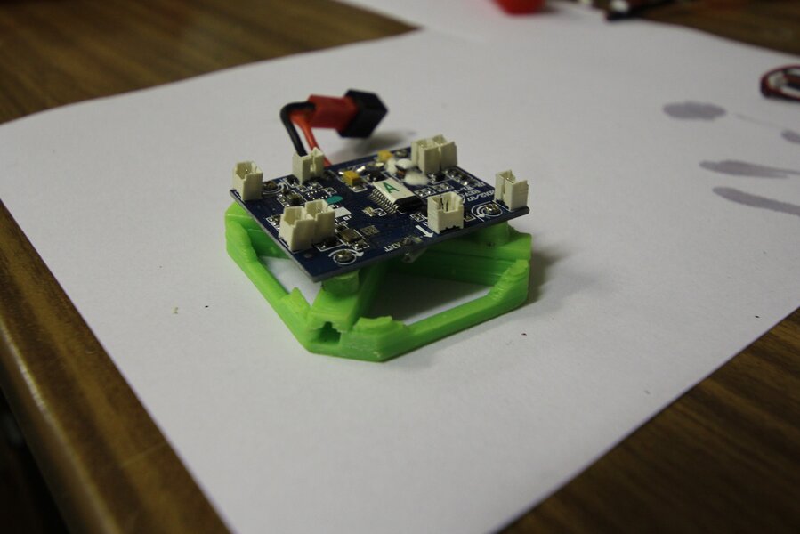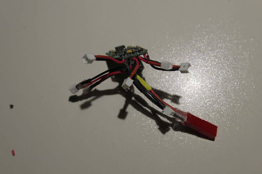 Beleuchtung und Motoren wieder zusammenstecken, fliegt wieder. Er wiegt so wie er da Steht (ohne Akku) 86 Gramm. Schwebt bei Halbgas, also alles im Grünen bereich.