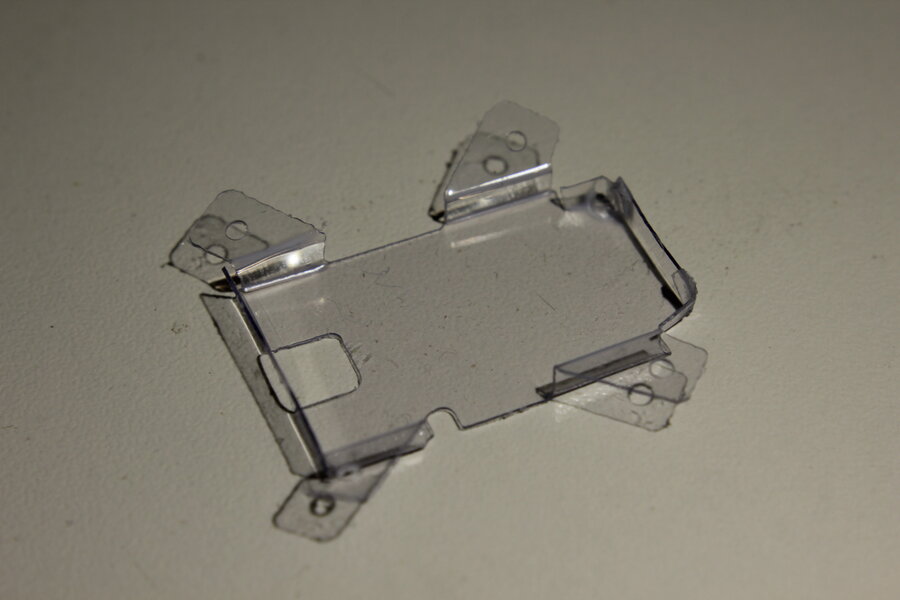 Aus einer durchsichtigen Plastikverpackung hab ich eine Befestigungsplatte gefräst. Diese wird auf die bereits vorhandenen Abstandshalter auf der Centerplate angeschraubt. Die Platine kommt mit etwas Schaumstoff als Unterlage mittendrauf und wird von dem “Bügel”, der auf der Unterseite in eine Lasche gesteckt wird, festgehalten. (v949_mwcmount.dxf)