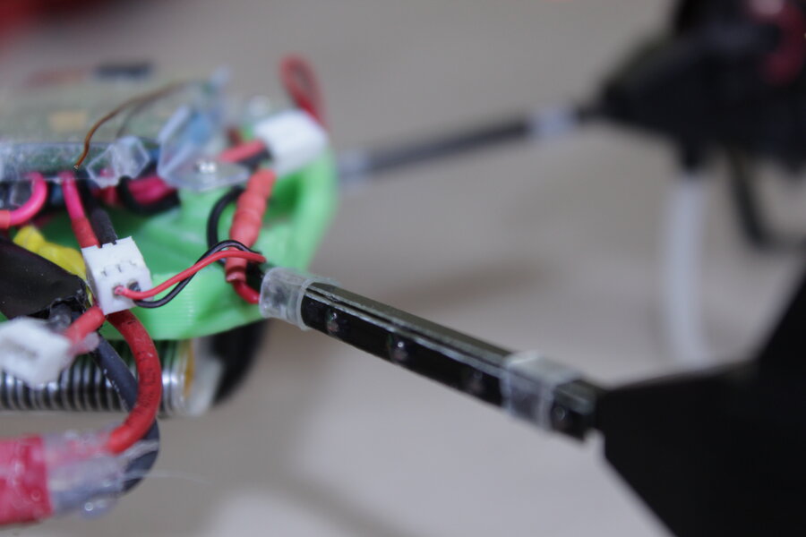 Da die GFK Arme nicht wie die Original Carbon Stäbe ein Loch in der Mitte für die Kabel haben, mussten die Kabel zu den Motoren außen entlang geführt werden.