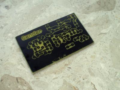 - Bedrucktes Papier passend auf die Platine legen und durch den Laminator schieben, der Toner sollte sich auf die Platine komplett abdrucken