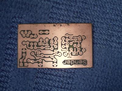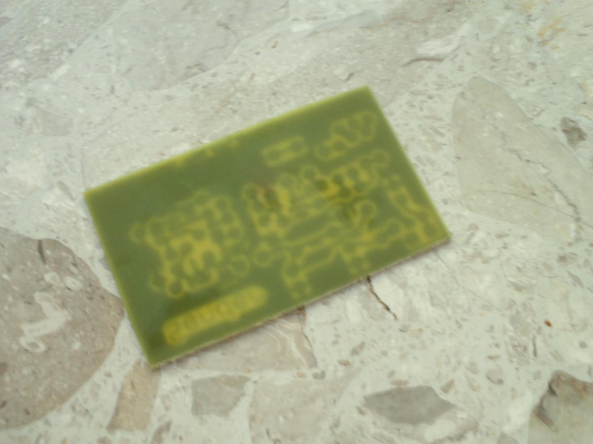 - Bedruckte Platine in 50°C warmes aufgelößtes Natriumpersulfat tauchen und so lange warten (und ggf. bewegen) bis sich das Kupfer überall da gelößt hat, wo kein Toner ist