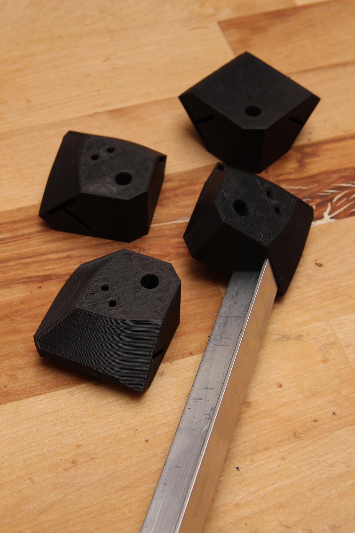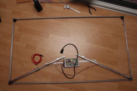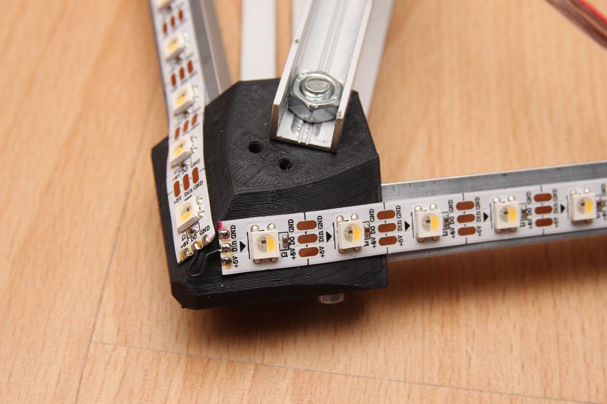 Als Lösung habe ich dazu einen Rahmen aus Aluminium T-Profilen gebaut, welcher mit an die Wandbefestigung montiert wird und frei zwischen TV und Wand hängen soll. Verbunden werden die T-Profile durch gedruckte Eckstücke. Für eine Ausleuchtung bis in die Ecken lassen sich die SK6812 LED Streifen bis über die Plastikecken kleben. An zwei der vier Verbindungspunkte wird die Spannung eingespeist inkl. 1000µF 16V Kondensator.