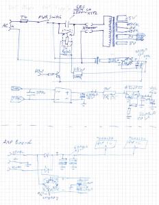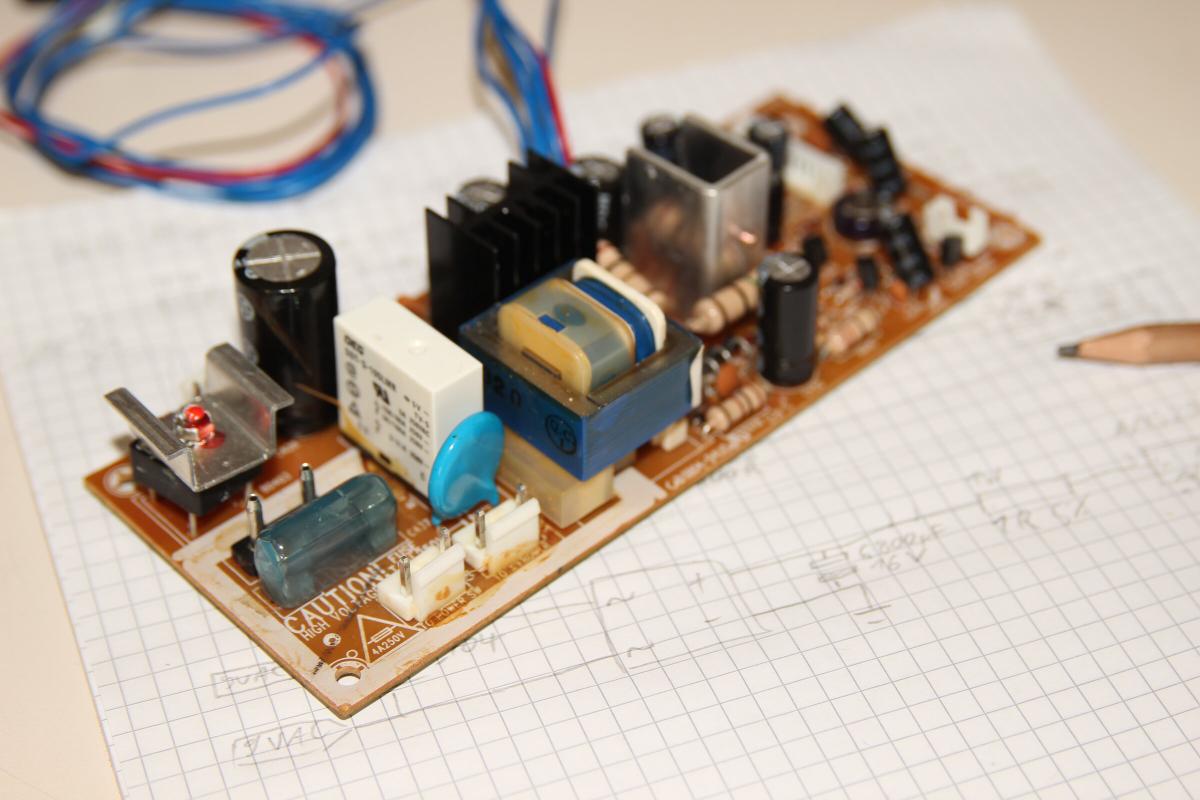 Diesen habe ich aus einem defekten DVD-Player mit 5.1 Verärker ausgeschlachtet. Das erste Bild zeigt eine der Platinen aus dem DVD-Player, die mit dem Trafo was zu tun hatten. Darauf ist ein Einschaltstrombegrenzer zu finden, da größere Ringkerntrafos schonmal damit Probleme machen. Desshalb habe ich den relevanten Teil der Platine nachgezeichnet und versucht ähnlich umzusetzen. Irgendwas wird der Hersteller sich ja schon dabei gedacht haben.