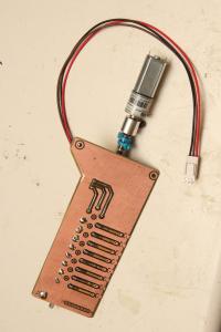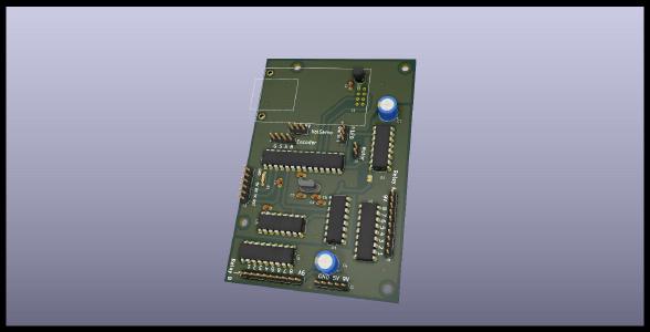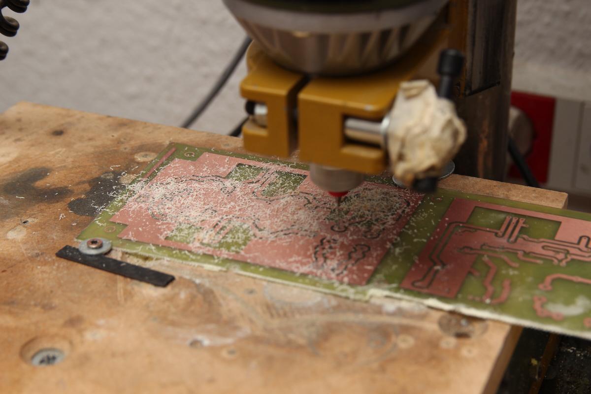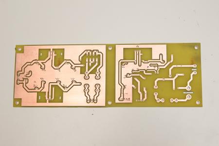 Hier zu sehen ist einer der ersten Prototypen der Stromversorungsplatine. Ich glaube diese habe ich mit vier Exemplaren am öftesten geätzt. Der Netzspannung führende Teil wurde später auch auf eine eigene Platine ausgelagert, um in einem Plastikgehäuse Schutzisoliert untergebracht sein zu können, da das Metallgehäse des Mixers nicht zwangsläufig geerdet ist.