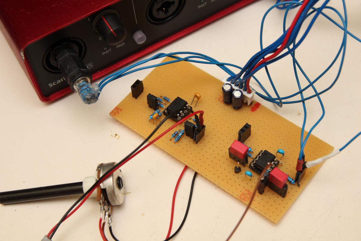 Der Testaufbau umfasst zwei Opamps, wovon einer als Eingangspuffer dient und der zweite als Summierer verschaltet werden kann.