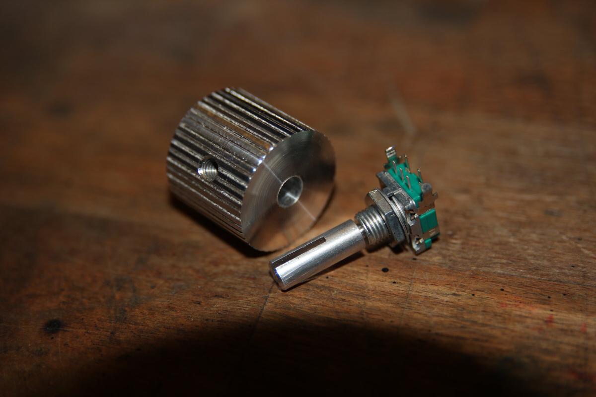 Lautstärkeregler und Eingabemöglichkeit bildet ein Encoder mit Drucktaster. Den Drehknopf habe ich gedreht/gefräst und anschließend eloxiert.