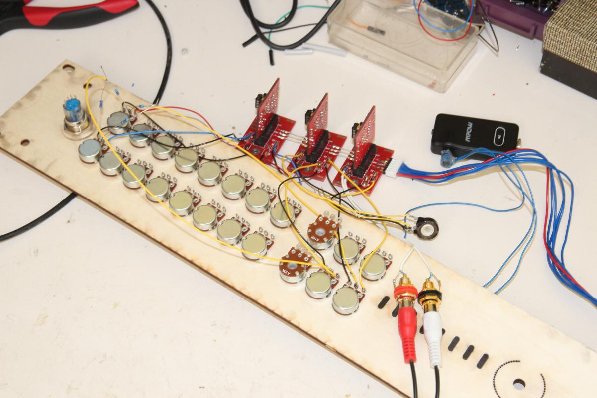 Das Frontpanel ging durch viele Iterationen und wurde dazu aus Pappelsperrholz gelasert. Hier eine frühe Version mit Schaltern als Kanalwahl.