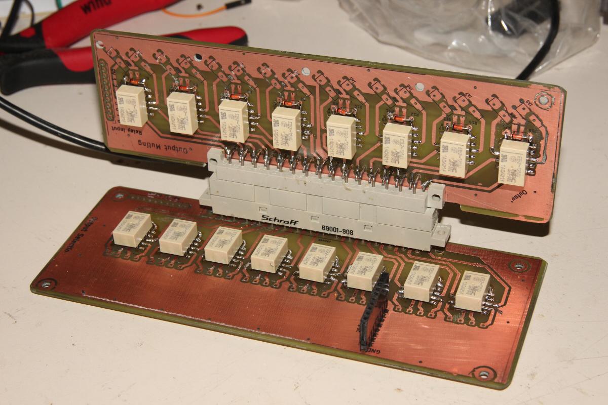 Zur Abwechselung mal etwas, das so garnicht funktioniert hat. Um die Konfigurierbarkeit hoch zu halten habe ich zu Beginn die drei Schaltungen Inputbuffer, Summierer und Outputbuffer auf kleine Steckplatinen mit PCI-Express 1x Edgeconnector umgesetzt. Der Kontakt war dabei jedoch nicht ausreichend, sodass bei kleinen Bewegungen knacken und Rauschen zu hören war. Ein paar der Opamps sind dabei glaube ich sogar gestorben. Also war dieser Ansatz raus.