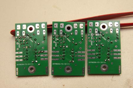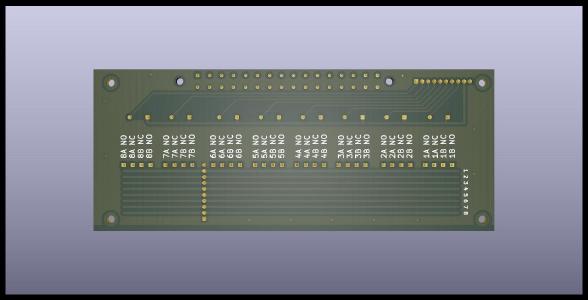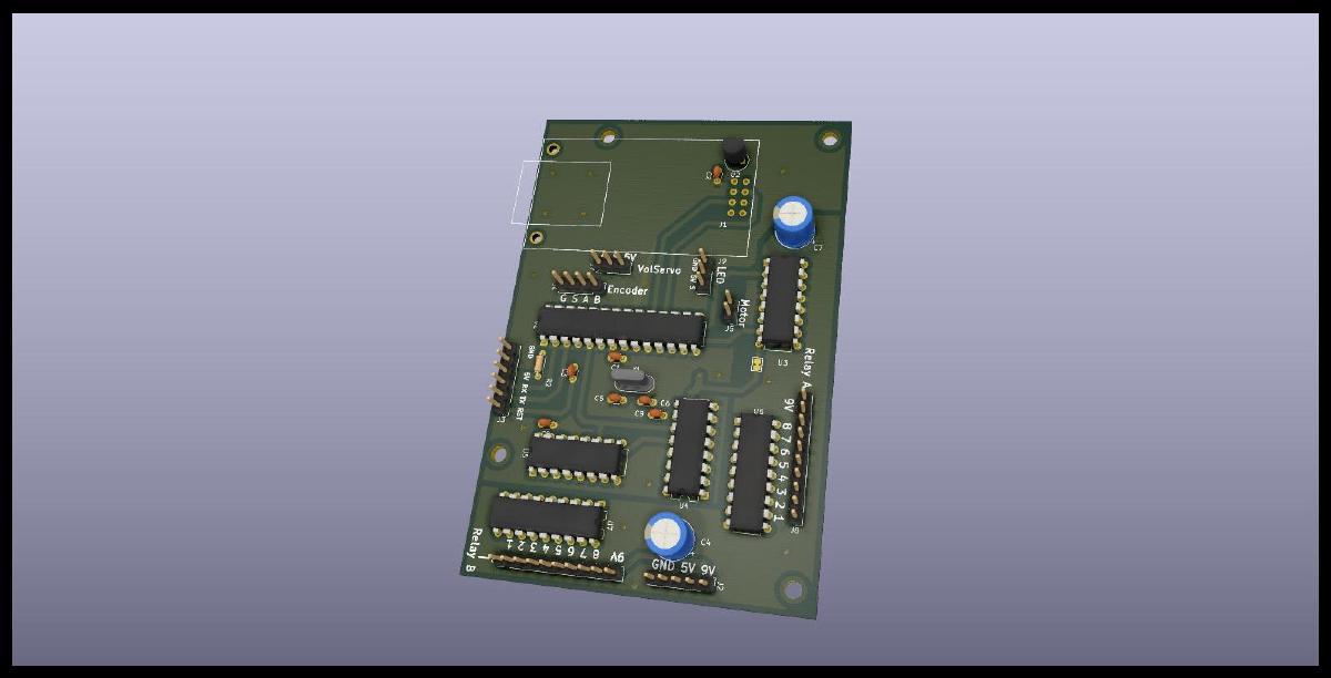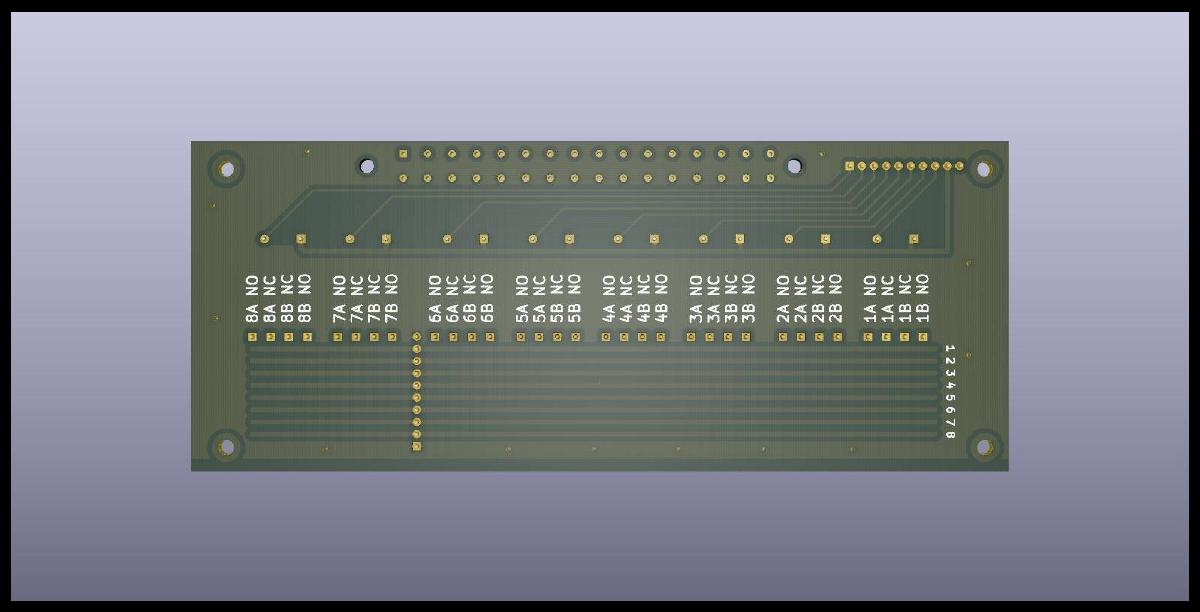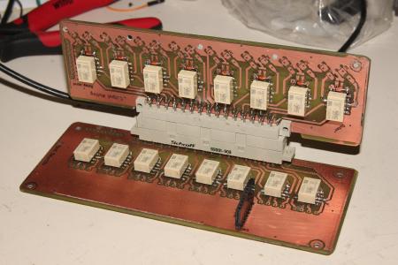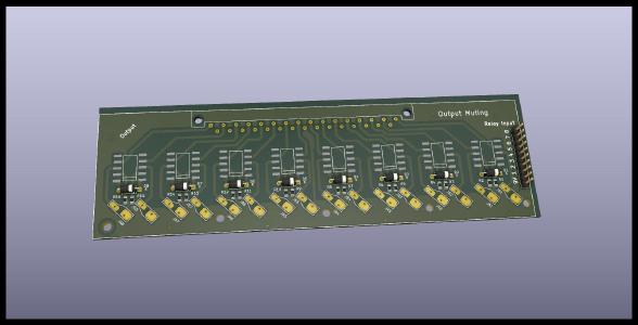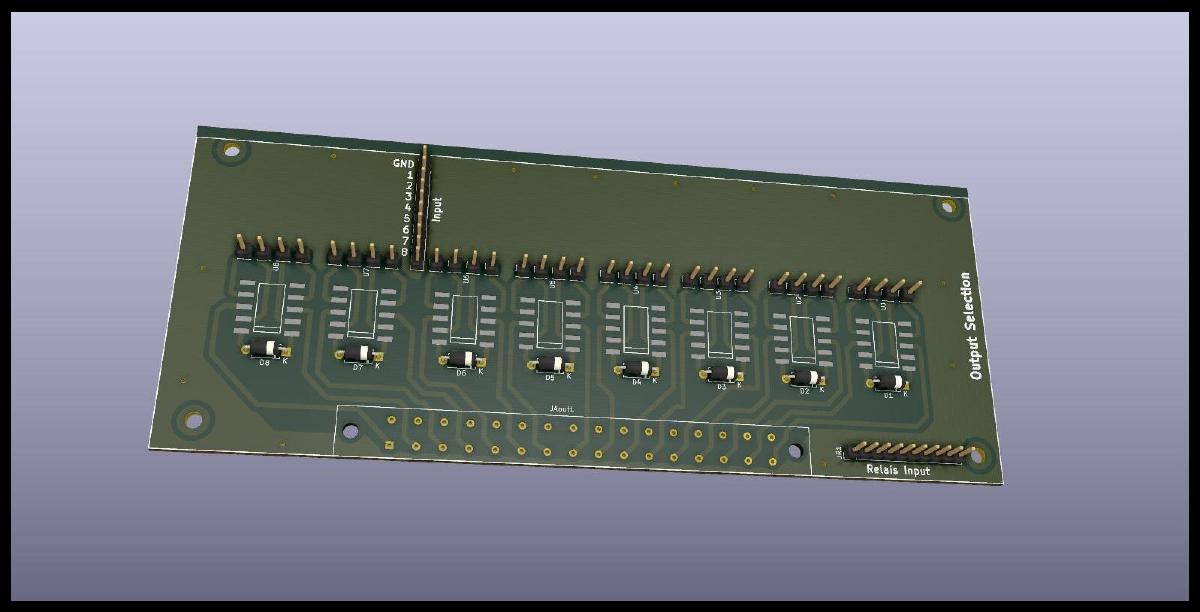 Unter der “Main Volume” Platine befindet sich die Kanalauswahl “Output Selector”. Jedem der acht Stereoausgänge können zwei Gruppen zugewiesen werden. Hierzu wird ein Kabel angelötet von z.B. “5A NC” (Ausgang 5 Links Normally Closed) auf eine der horizontalen Leiterbahnen 1-8, welche mit den Gruppen verbunden sind. Damit wäre es möglich in einem Surround Lautsprechersetup die hinteren Boxen auf den Front-Kanal zu legen. NC (Normally Closed) und NO (Normally Open) bezeichnen hierbei die Kontakte der NEC-EB2-12NU Relais. Diese wurden ebenfalls zum Stummschalten der Ausgänge auf der nachfolgenden Platine verwendet.