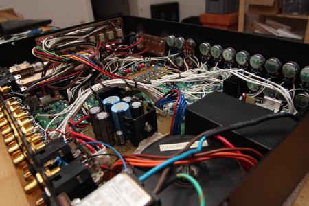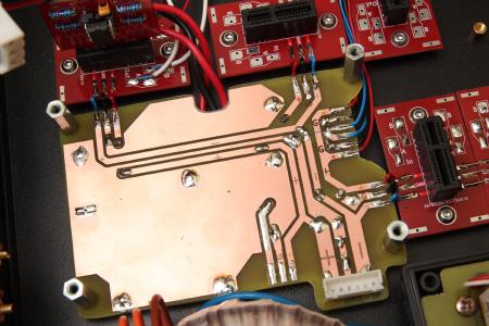 Unten rechts auch schön zu sehen die Massepotentiale. Von links nach rechts: Analogmasse, Digitalmasse, Schutzerde, Gehäuse. In diesem Fall sind alle durch einen Alukamm miteinander verbunden.